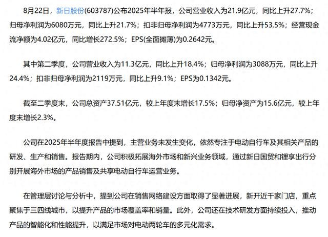 今年,两轮出行行业深陷“三重压力”的困局:消费需求疲软拉低市场活力、政策合规门槛持续抬高准入标准、同质化竞争加剧让多数品牌陷入增长停滞的僵局。当行业增速集体放缓国家允许的配资平台,新日电动车却以“逆行者”姿态强势突围——在8月22日最新发布的半年度财报显示:新日股份一、二季度连续增长,上半年整体营收21.9亿元,同比增长27.7%,归母净利润6080万元,同比劲增21.7%。