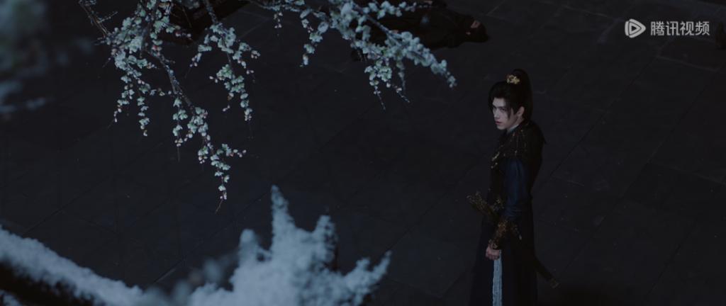 比如下面这个场景,用梅花、积雪、古建筑映衬男主的少年将军形象。