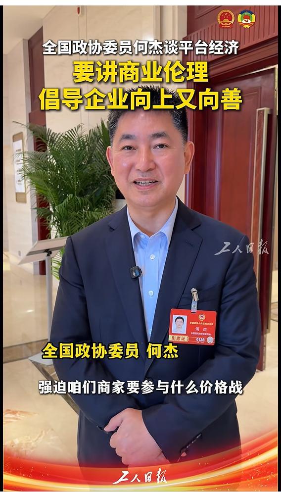 据工人日报,全国政协委员何杰表示: 平台不得利用优势地位,强迫商家参与价格战,也不能让员工困在算法中。这方面除了要采取法律手段之外,实际上还应该提倡中国的商业伦理规范。我们下一步可能就不能光评选一些富人榜,可能要发布一些好人榜,来倡导企业向上又向善。