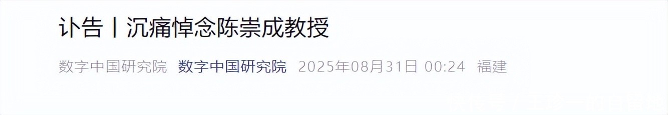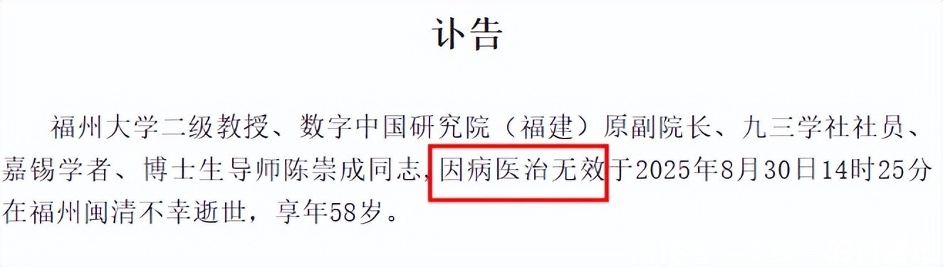 根据该研究院发布的讣告可知,陈崇成教授是在2025年8月30日下午2点25分因病医治无效去世,终年58岁。