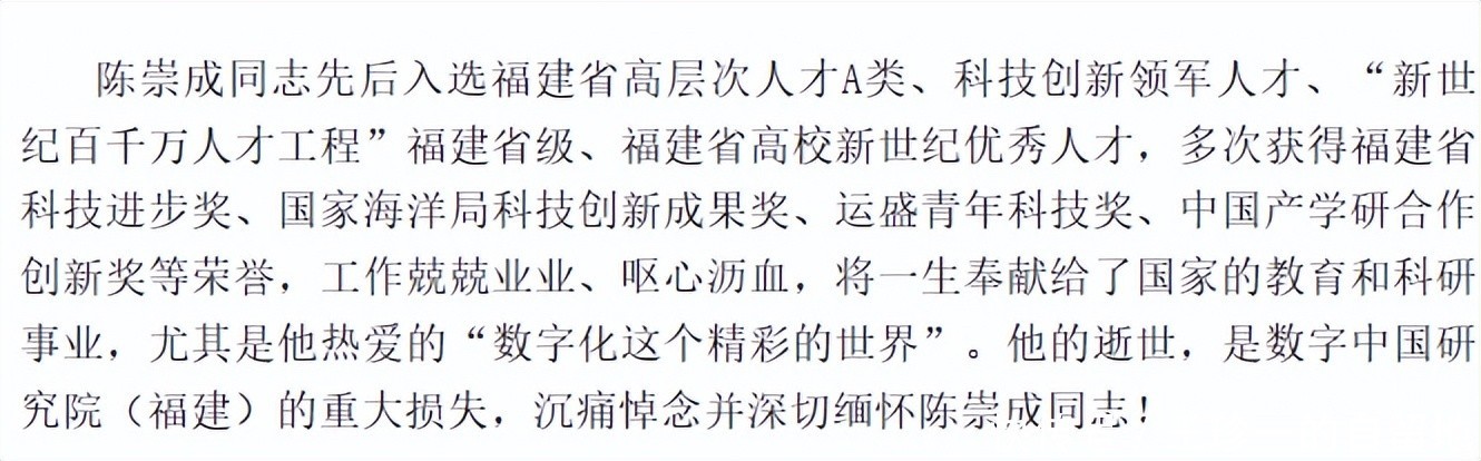 讣告中对陈崇成教授做出的成绩高度认可和赞誉。