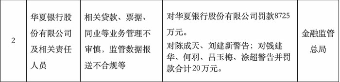 与此同时,多名相关责任人员也受到了相应处罚:陈成天、刘建新两人被给予警告处分,钱建华、何羽、吕玉梅、涂超四人则被警告并处以总计20万元的罚款。