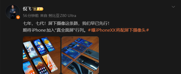 【CNMO科技消息】3月31日,中兴通讯终端事业部总裁、努比亚技术有限公司总裁倪飞发文,回顾了国产手机在屏下摄像领域的七年探索历程。他直言:“七年,七代!屏下摄像这条路,我们早已先行!”并公开喊话,期待苹果早日加入“真全面屏”行列 。