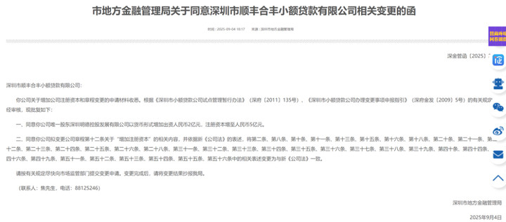 9月4日,深圳市地方金融管理局官网发布一则通知,通知显示,同意深圳市顺丰合丰小额贷款有限公司(本文称“顺丰小贷”)变更注册资本以及章程变更中国股票配资官网,注册资本由3亿元增至5亿元。